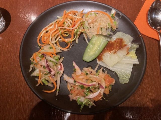 サラダというか冷菜は種類が豊富で、野菜も多くて、美味しかったです。青パパイヤのサラダが病みつきになってしまうのよね〜なんででしょう?蒸し野菜もシンプルですが、ソースをつけて頂くと、沢山頂けます。ソースは辛いのですが、コクがあって美味しかったです。