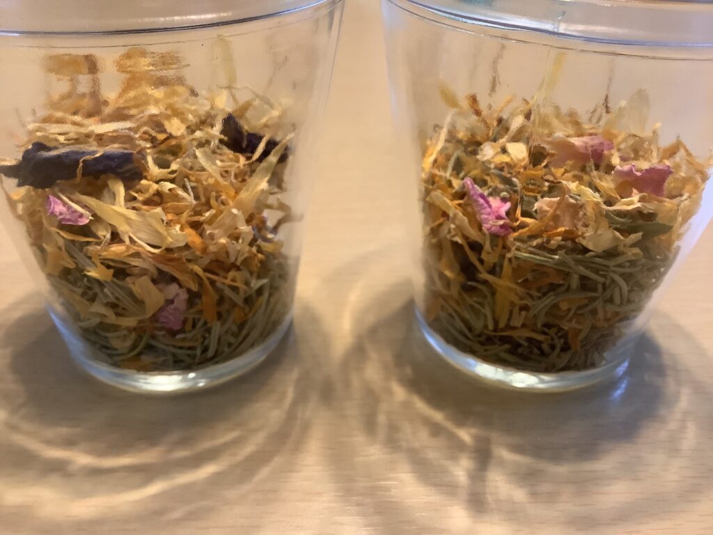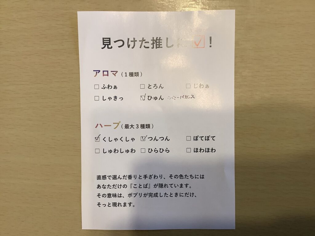 okakaoはアロマは「ひゅん」を選びました。ハーブはメインは「くしゃくしゃ」と「つんつん」ですが、色々入れても良いよということで、全種類入っています。ハーブはローズが2種類、黄色はカレンデュラ、紫色はラベンダー、その他は忘れました。笑