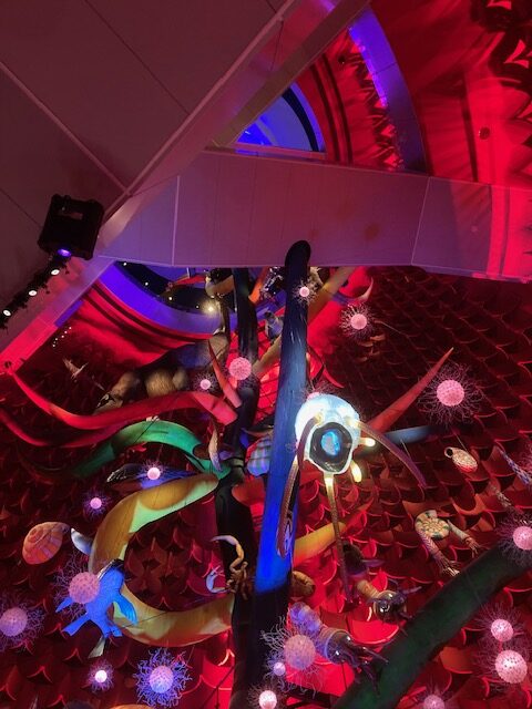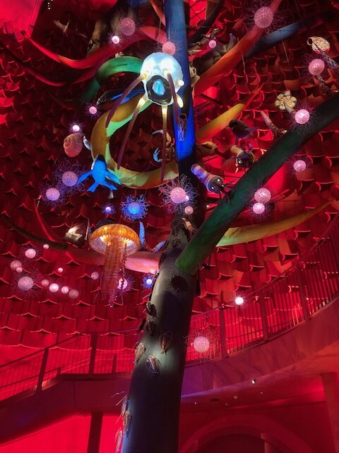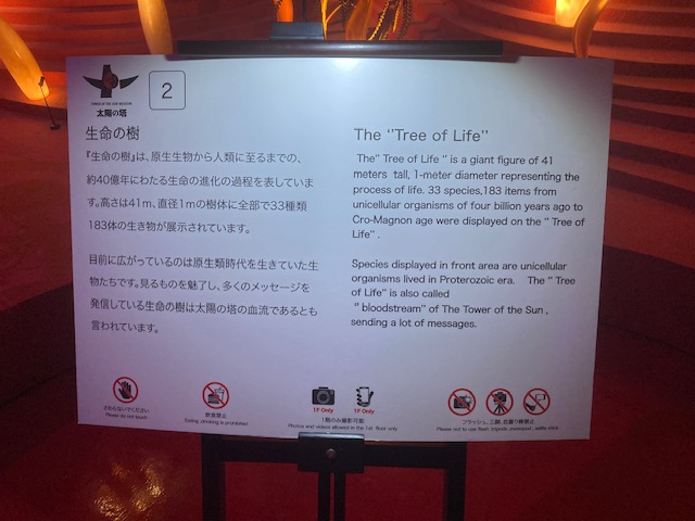 この太陽の塔はテーマの「人類の進歩と調和」を表現するパビリオンとして建てられましたが、中を見ると大変納得しますよ。太陽の塔の胎内には地下から上へと大きなオブジェがそびえたっていますが、単細胞生物からクロマニョン人まで時系列で飾られています。この生命の樹は圧巻です。写真がこちら