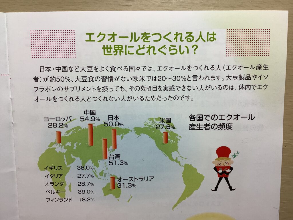 エクオールは女性ホルモンを助ける要となります。大豆イソフラボンが腸内細菌によってエクオールに生まれ変わります。ただこのエクオールを作れる日本人女性は2人に1人、50%なんですよ。なので、okakaoも去年の人間ドックのOPで調べてもらいました。okakaoはエクオールを作れない部類に入りました。エクオールはを作れる人の割合は国によって違います。